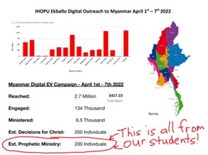 We had 2 sessions where we had the opportunity to evangelise with people from Myanmar. An advertisement in cartoon form is shown on various social media platforms. A person then chooses to receive ministry after reading through the cartoon. We then typed a word that we received from Holy Spirit in an online form. We as a team did not interact with the people ourselves because of language differences and barriers. The people from the University of Ekballo translated what we received and shared it directly with those receiving ministry.